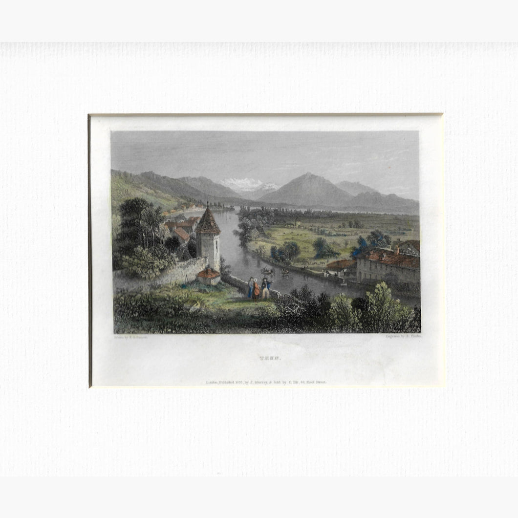 Antique, hand coloured, steel engraving showing Thun, in the canton of Bern.Drawn by T.S.Cooper, engraved by E. Finden, published by J.Murray, 1832.