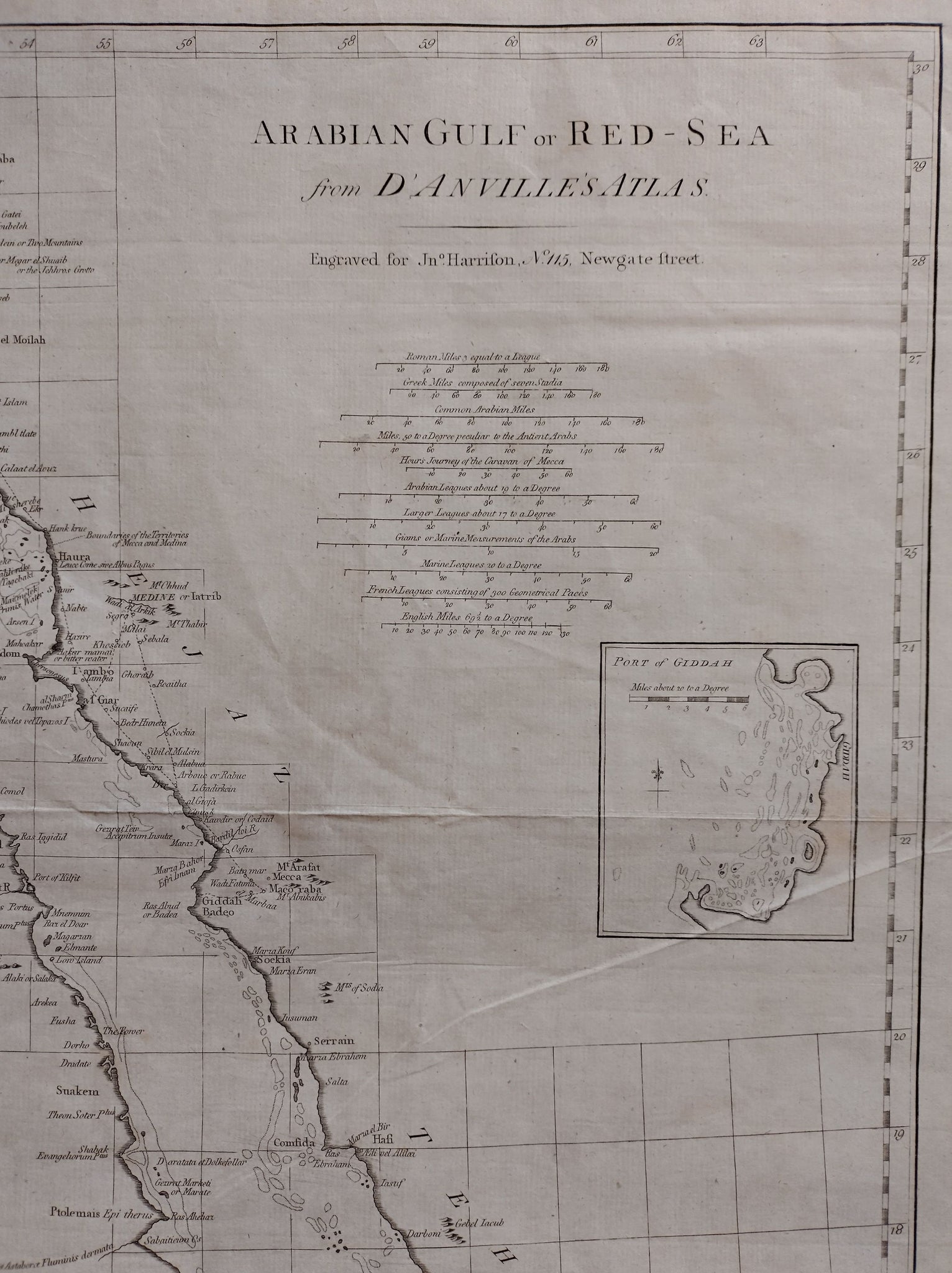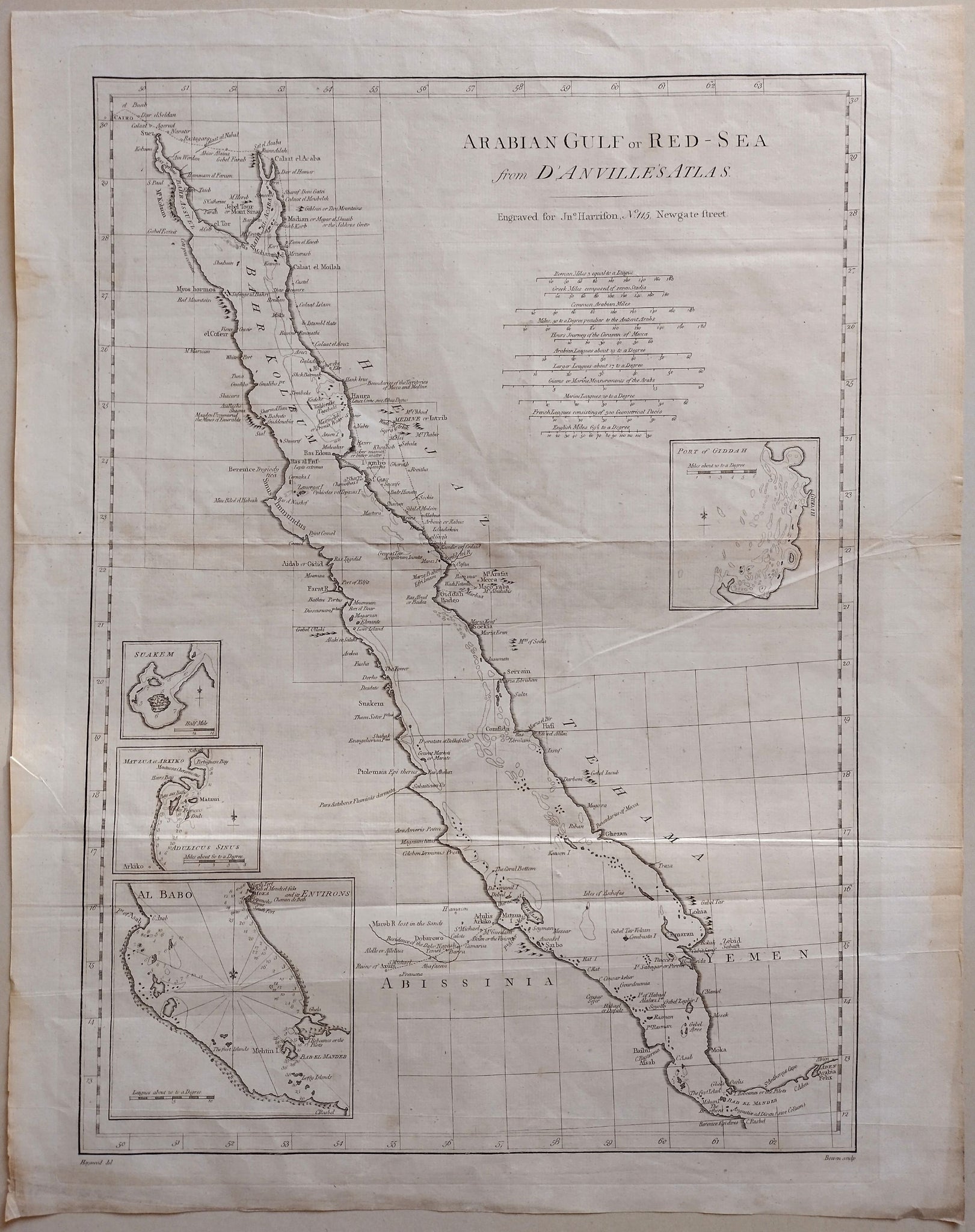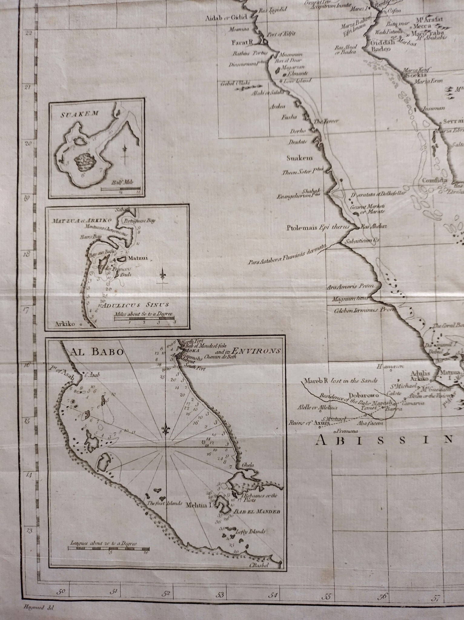 Antique, copperplate engraved map of the Red Sea, with inset maps of Port of Giddah, Suakem, Matzua et Arkiko, and Al Babo with Bab-El Mandeb.