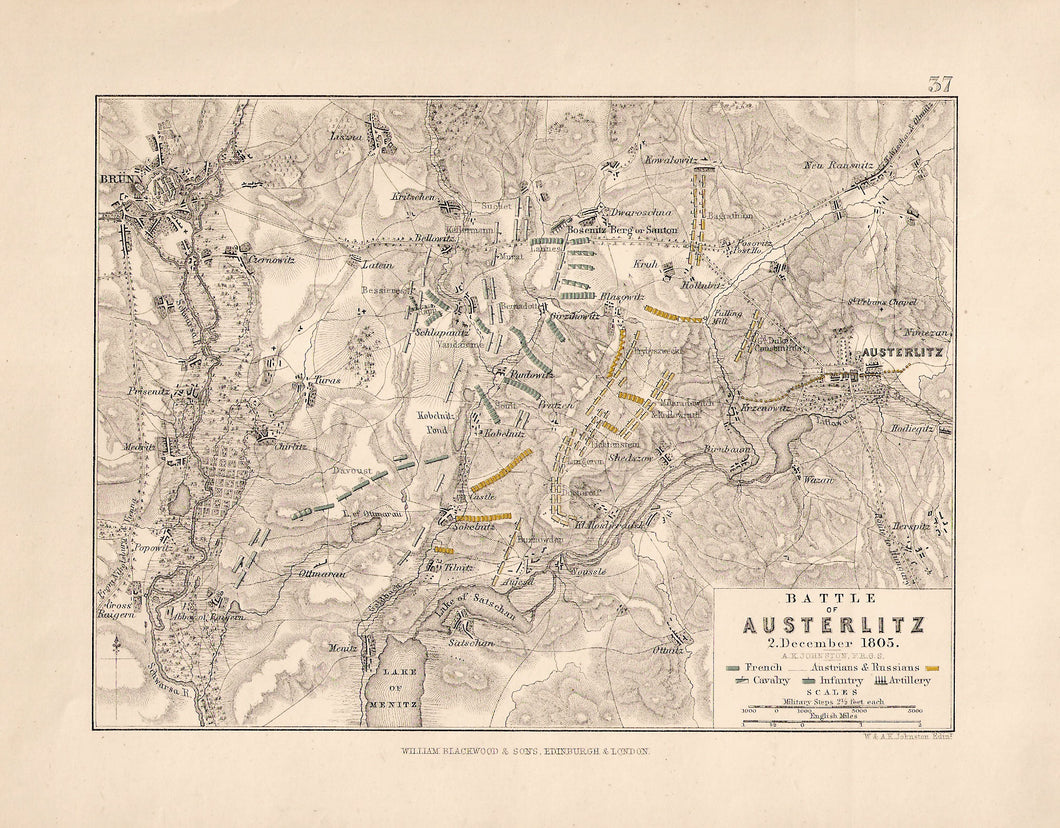 Antique, map of Battle of Austerlitz,1805.Lightly coloured map, by A.K.Johnston, showing French, Austrian, & Russian involvment in the Napoleonic wars.Published by William Blackwood & Sons, c. 1850.