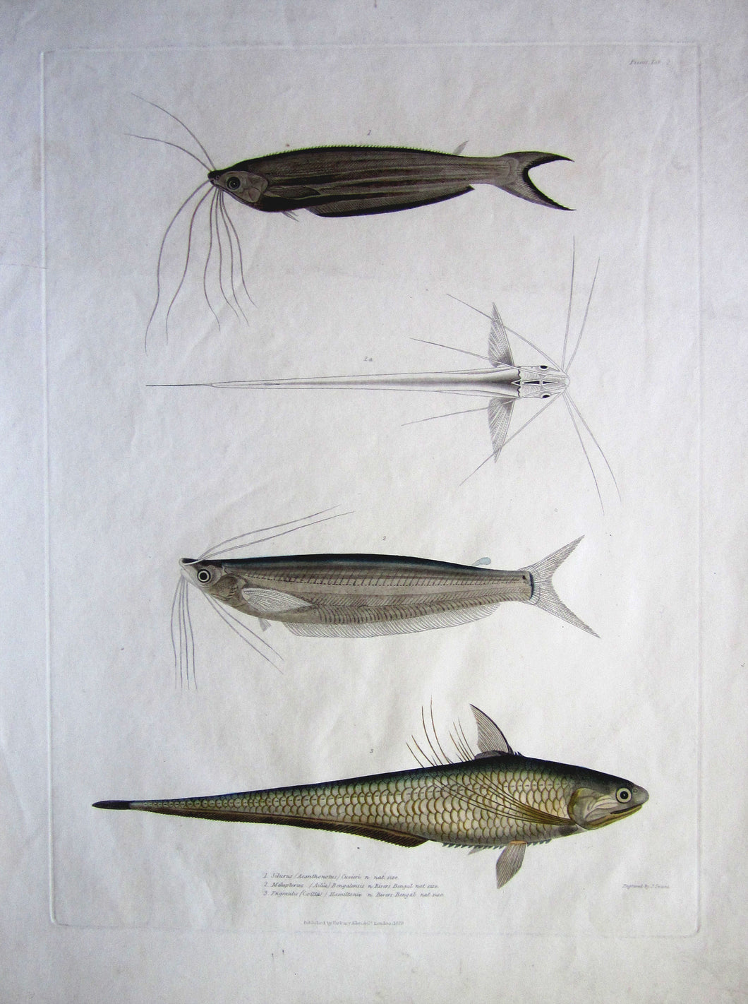 Antique Print, 1.Silurus (Acanthonotus) Cuvieri. 2.Malapterus (Ailia) Bengalensis, 3.Engrautis (Coilia) Hamiltonii.