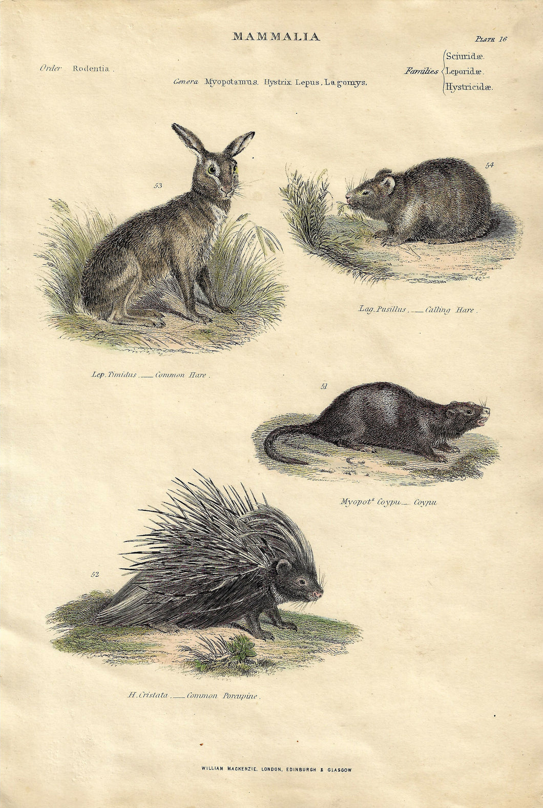Antique illustration, showing Common Hare, Calling Hare, Coypu and Porcupine.Published by William Mackenzie. The National Encyclopaedia, 1881.