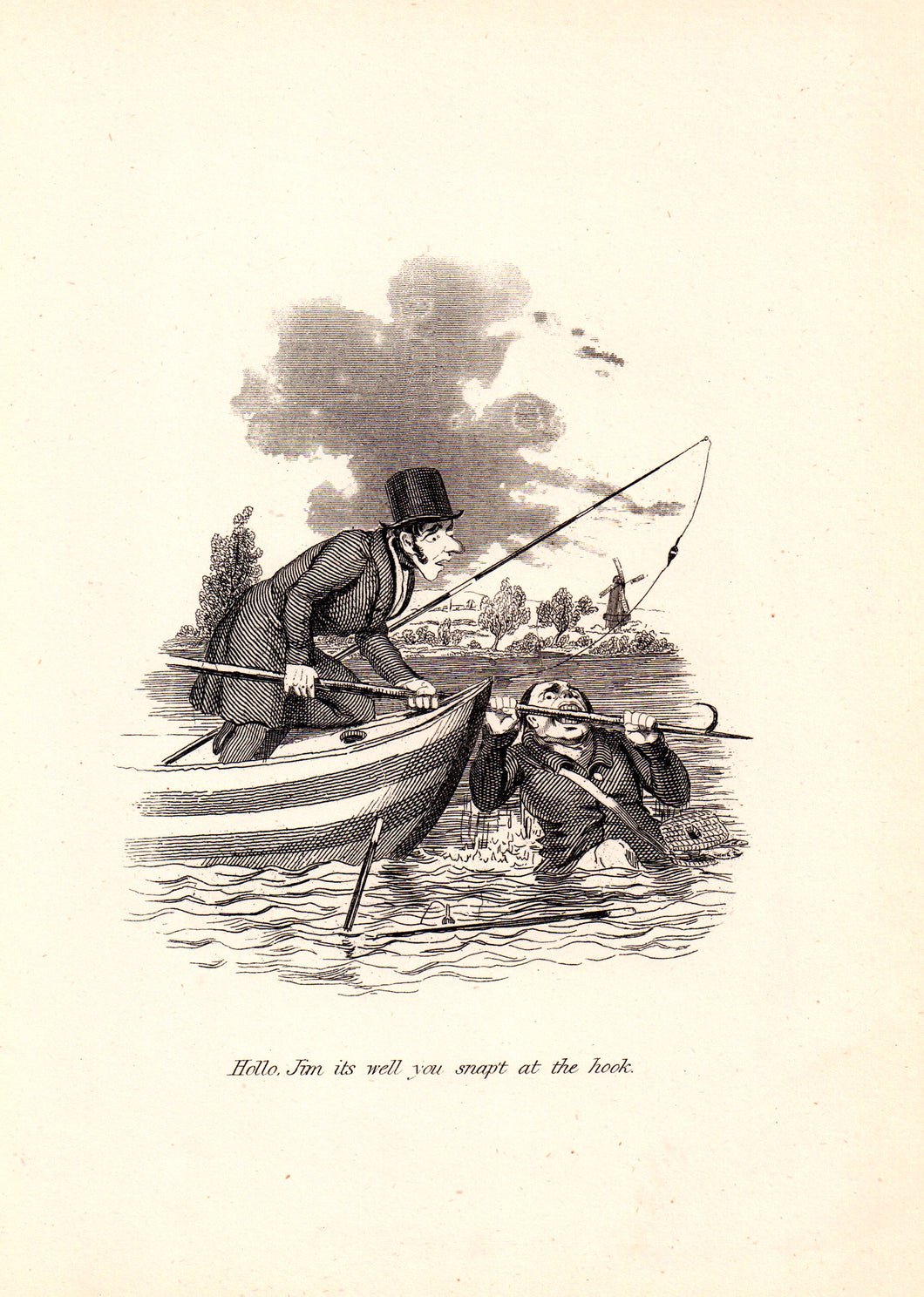 Antique Print, Humorous illustration of fishing.Wood engraving c.1900.